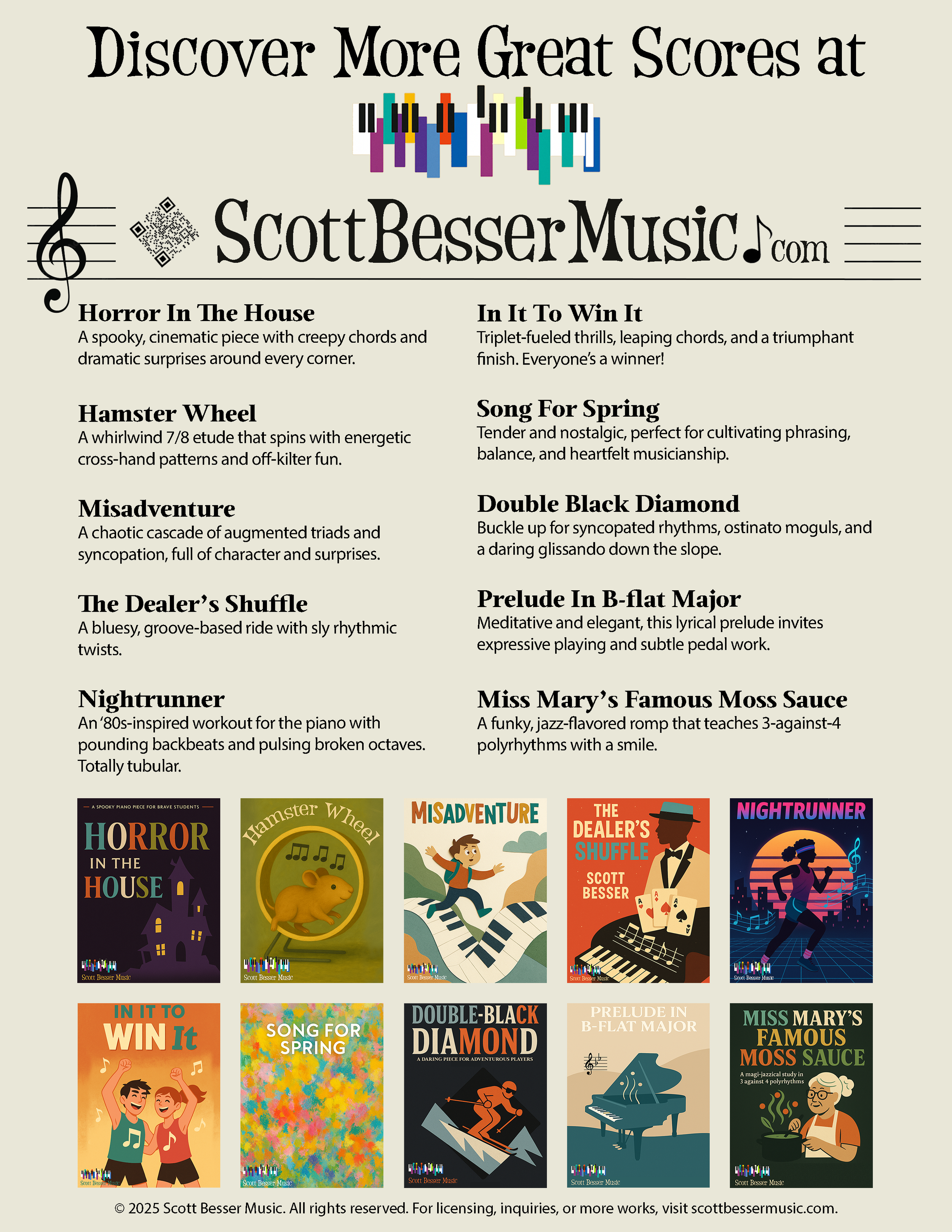 Engaging pieces that blend solid technique with memorable titles and vivid themes. Browse by tempo, key, or meter to find music that inspires you or your students!